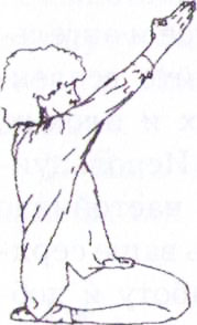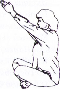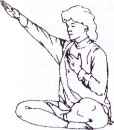 Сидя в Простой позе с прямым позвоночником, вытяните правую руку вперед под углом 45°, ладонь выпрямлена и смотрит вниз. Рука расслаблена, не надо вытягивать ее слишком сильно. Положите левую ладонь на сердечный центр.